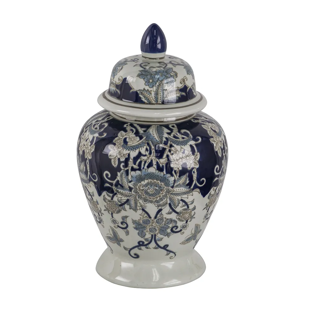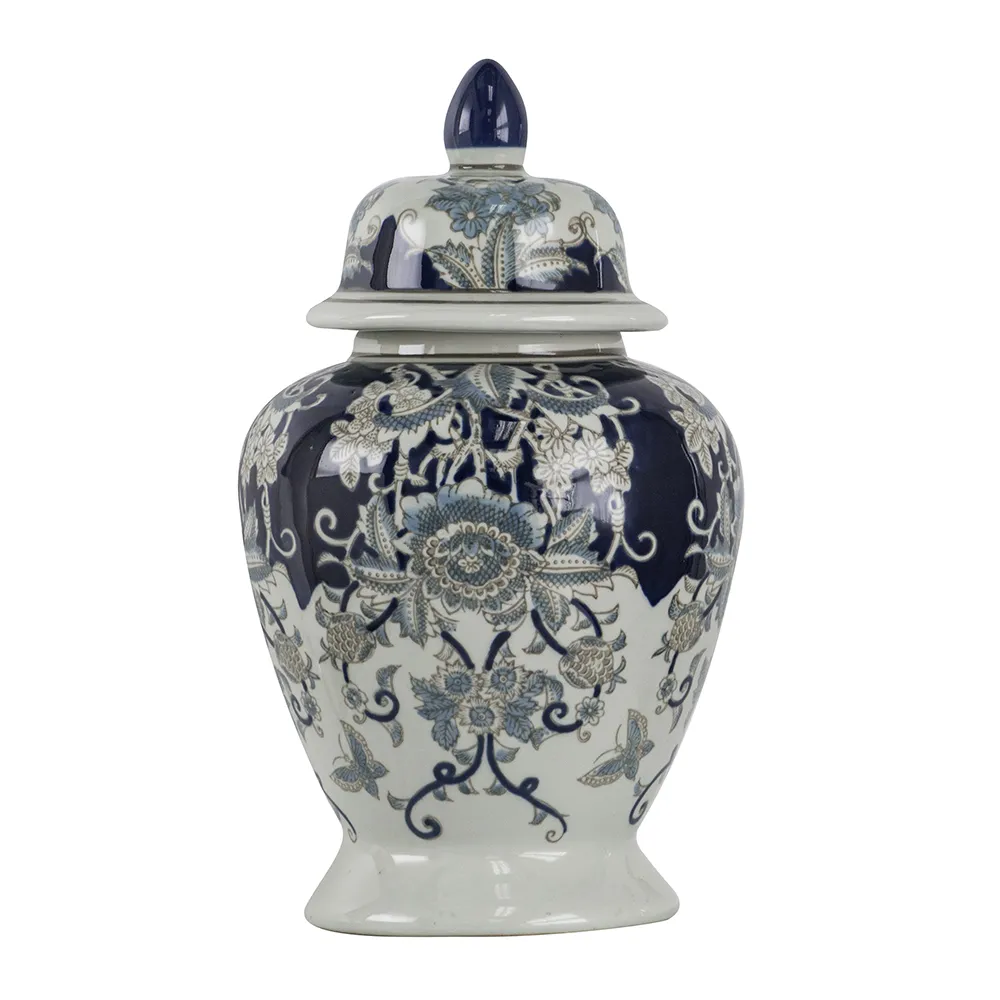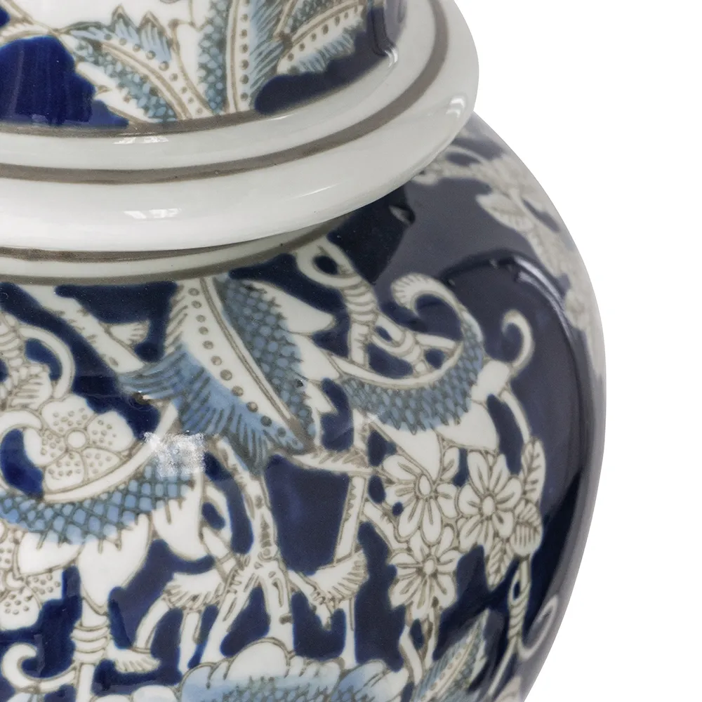 Masterfully crafted from glossy, high-quality porcelain, this ginger jar draws inspiration from Ming Dynasty designs to create a striking yet versatile home accent. Finished in a blend of deep blues and whites, it is sure to elevate any space whether displayed alone or filled with a vibrant arrangement of fresh or faux blooms.