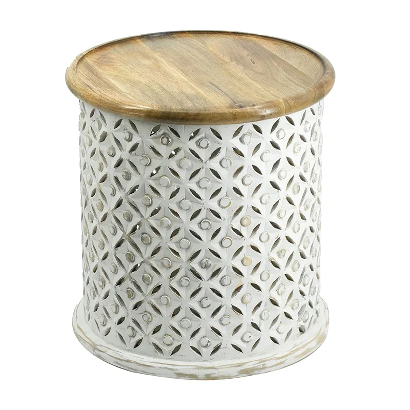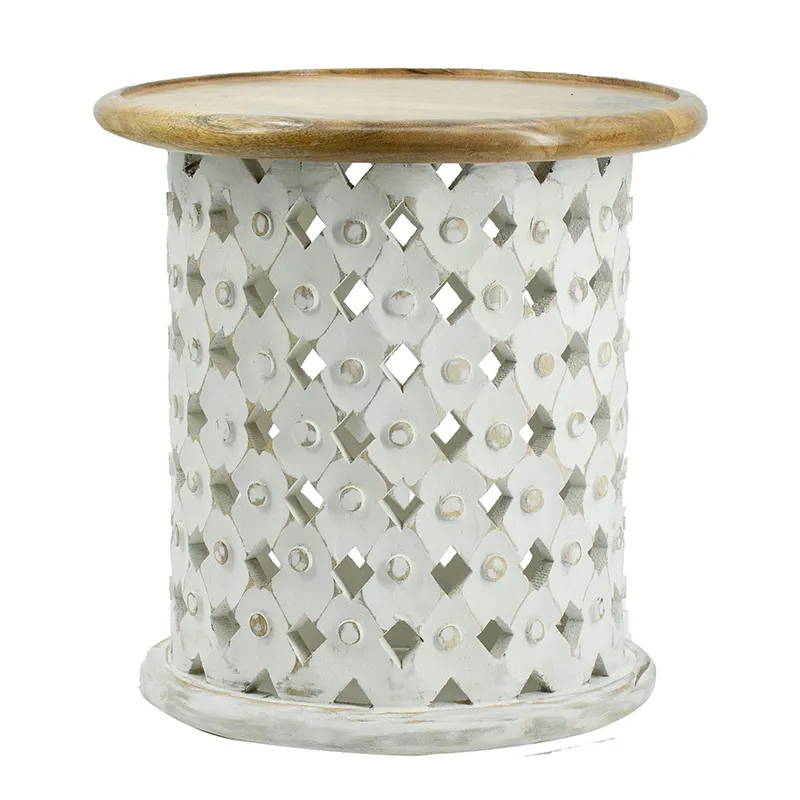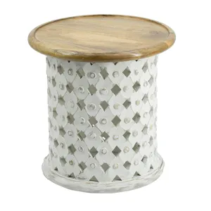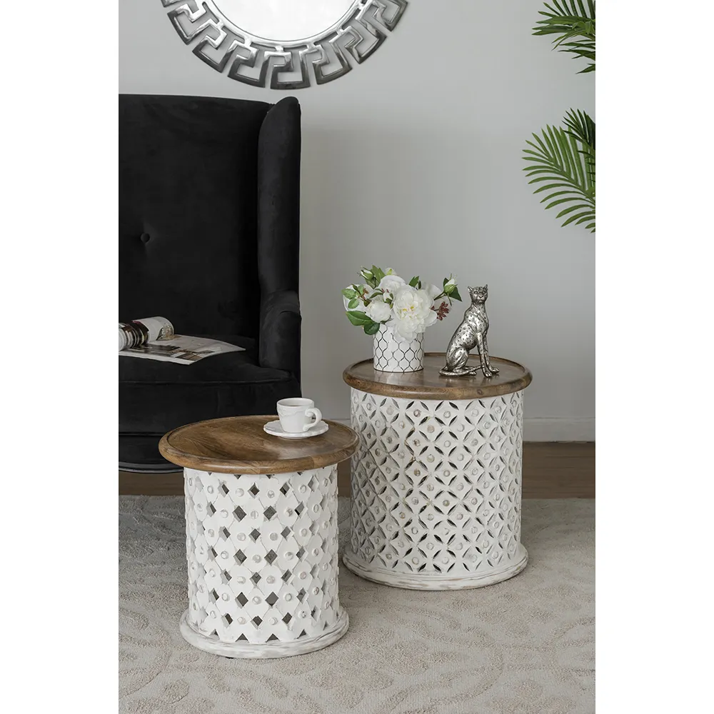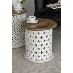 Crafted from naturally durable mango wood, each side table in this pairing boasts an Indian-inspired Jali cutting design that is finished in white to contrast the natural brown top. Whether they are used to flank your favorite couch or to display a decor ensemble, the unique visuals will spread a whimsical ambiance through your living room, entryway, or office.