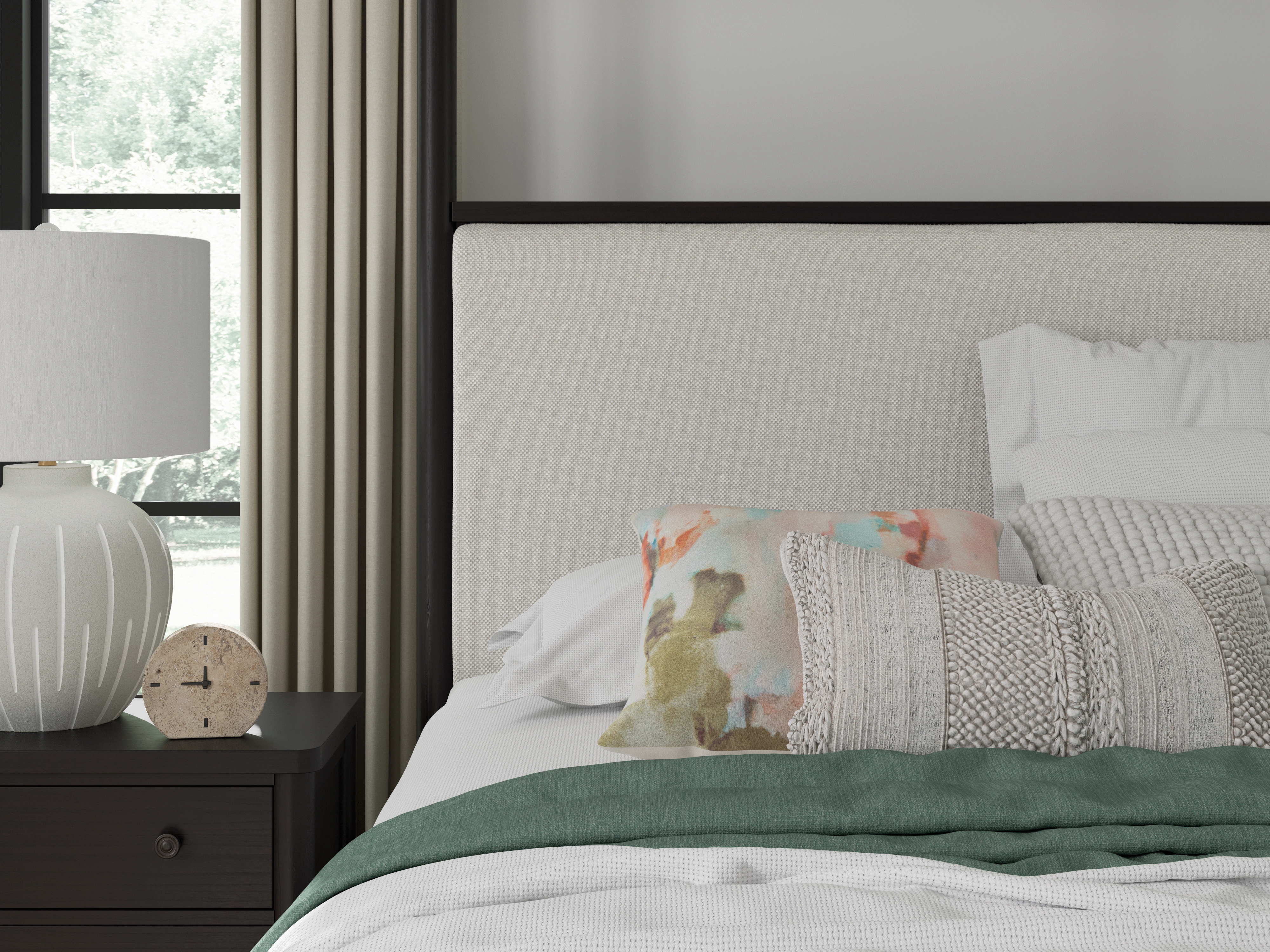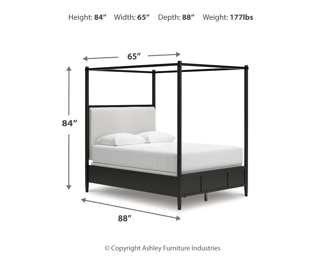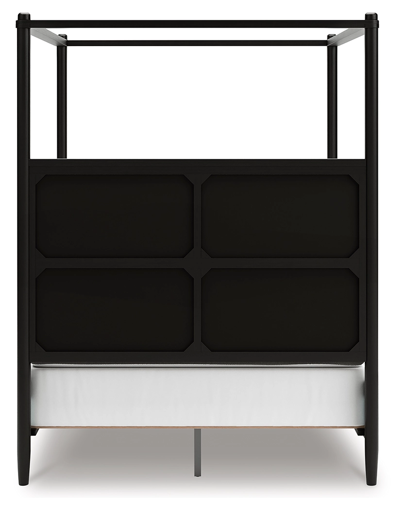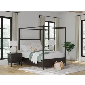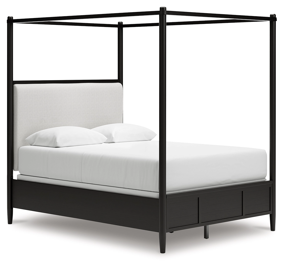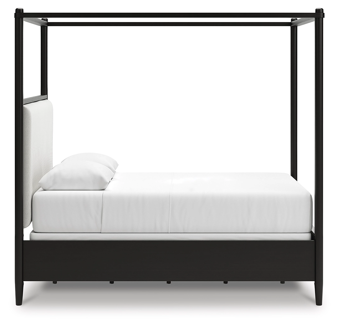 Farmhouse and contemporary design, balanced beautifully. This queen upholstered canopy bed merges simple aesthetics and round posts for an updated sensibility. Its cushioned headboard sports Next-Gen Nuvella™ performance fabric that’s easy to clean. A modern French black finish with deep warm brown undertones perfectly punctuates this casually inviting bed.