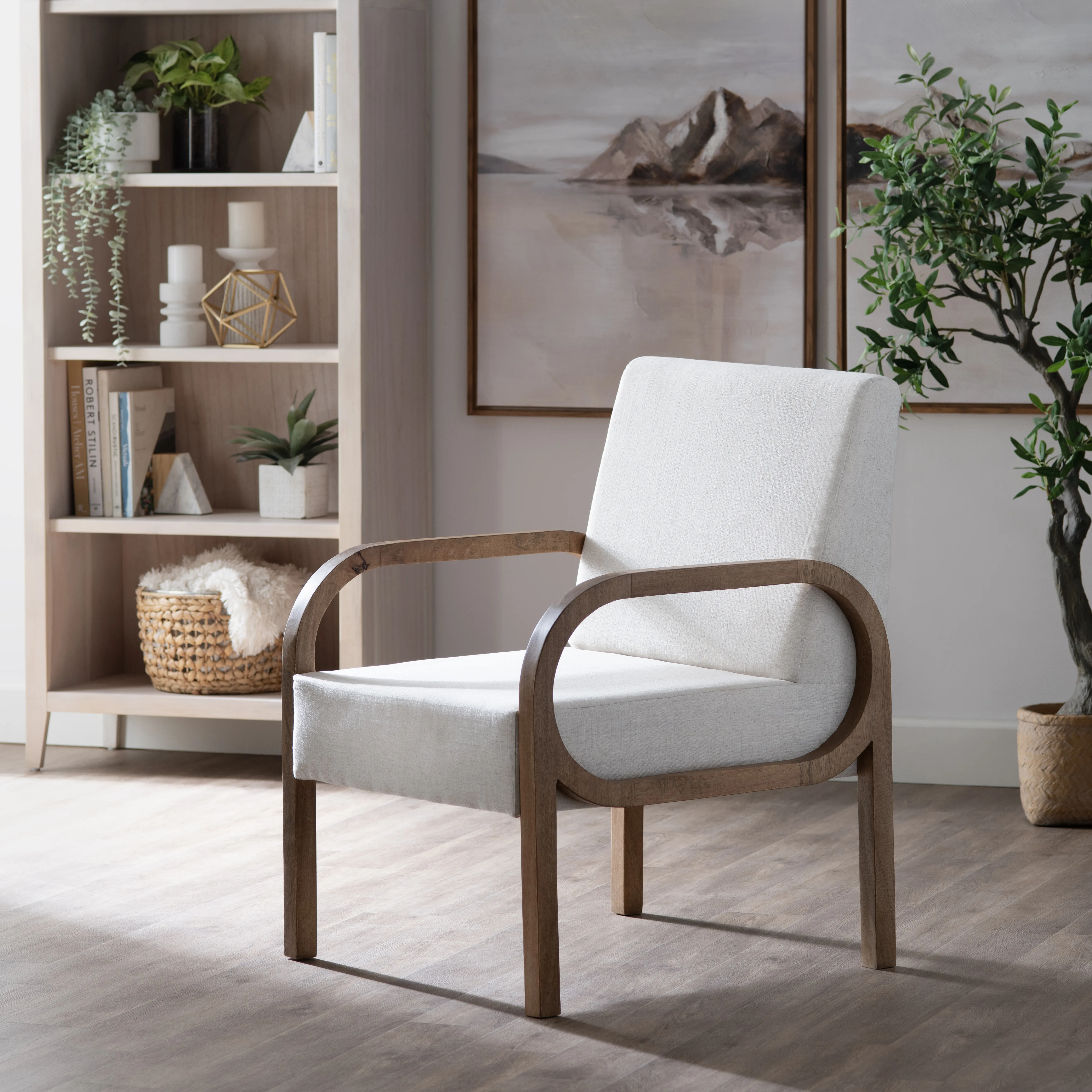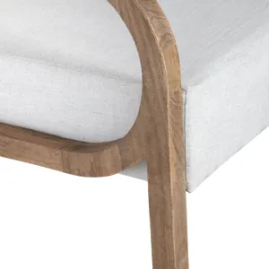 Elevate your space with this effortlessly stylish accent chair. Designed with a sculptural curved frame made from solid mango wood, it showcases a warm natural-stained finish for an organic touch. The off-white linen upholstery adds a soft, inviting contrast, while the fixed foam-filled cushion ensures comfort and support. Its rounded armrests and sturdy build create a perfect blend of elegance and durability. Ready to use right out of the box, this chair is a chic and cozy addition to any room