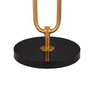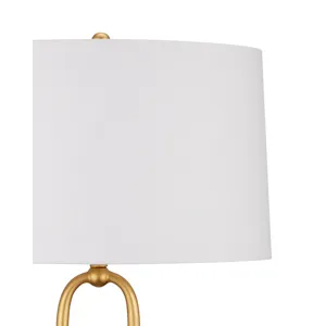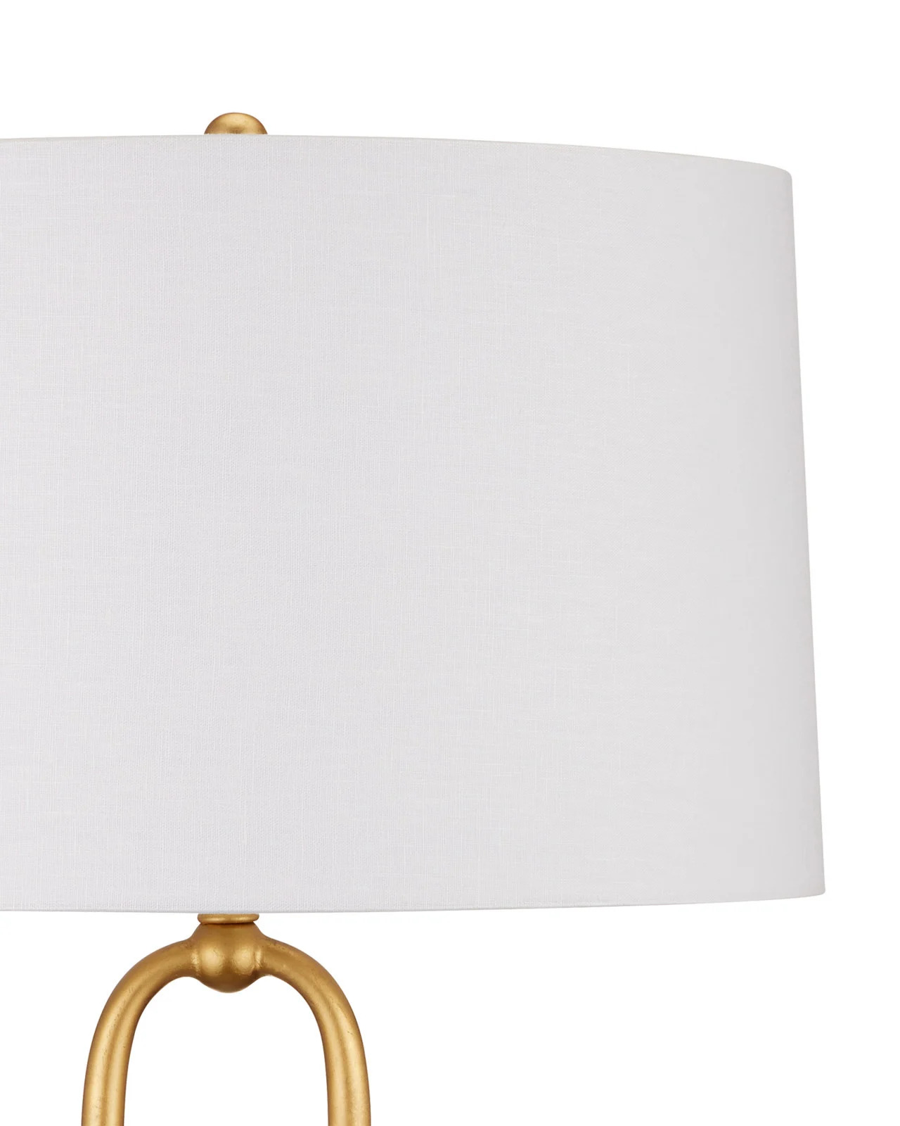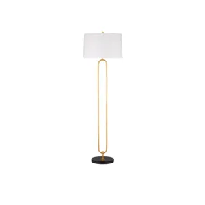 The oblong open-form body of the Glossary Floor Lamp is made of metal in a contemporary gold leaf finish. Designed to look like a giant paper clip that rises above a black marble base, this gold floor lamp is a perfect choice for a space needing stylish yet unobtrusive elements. The Glossary is topped with an off-white linen shade