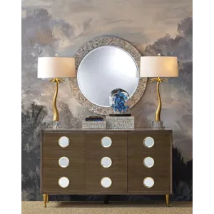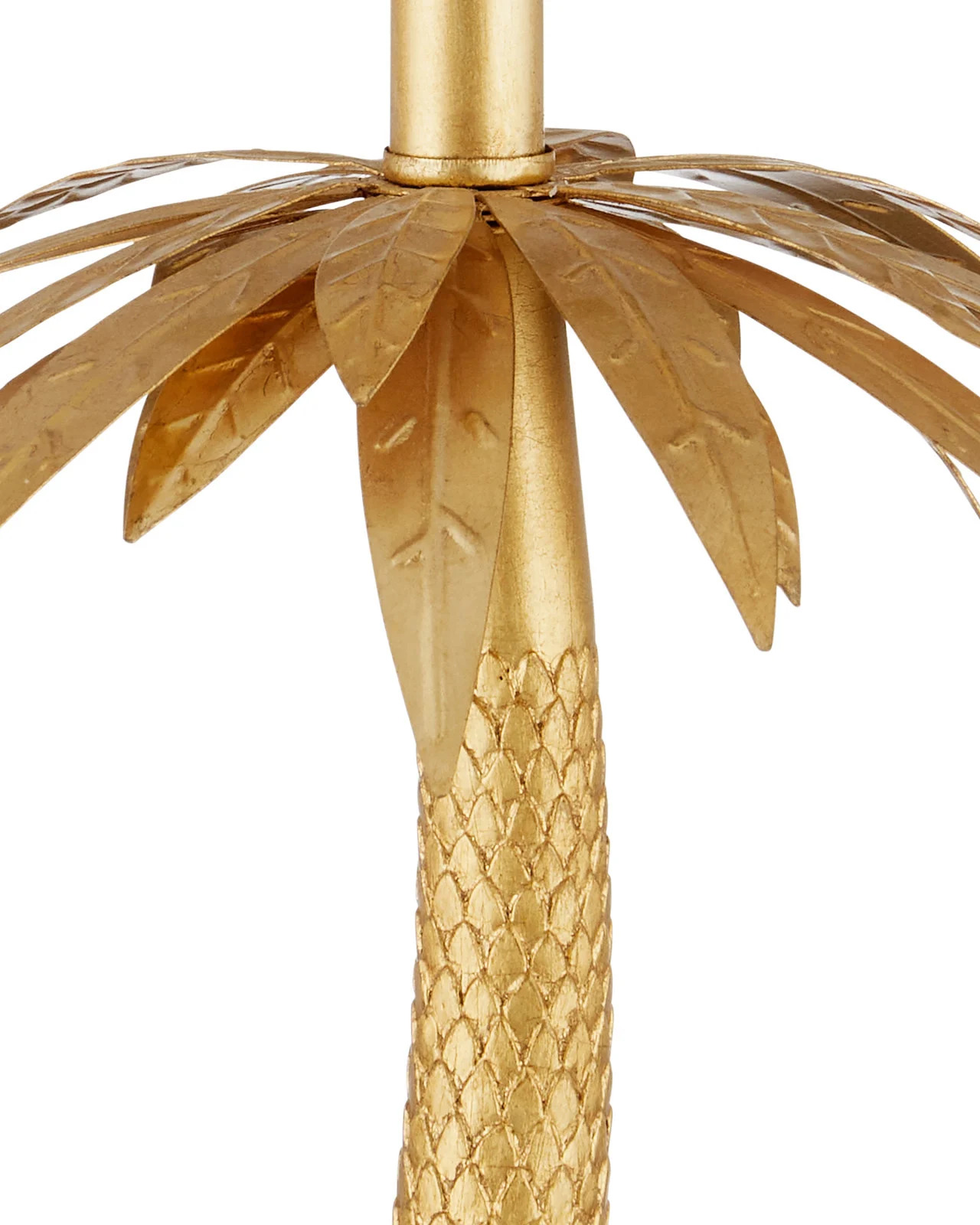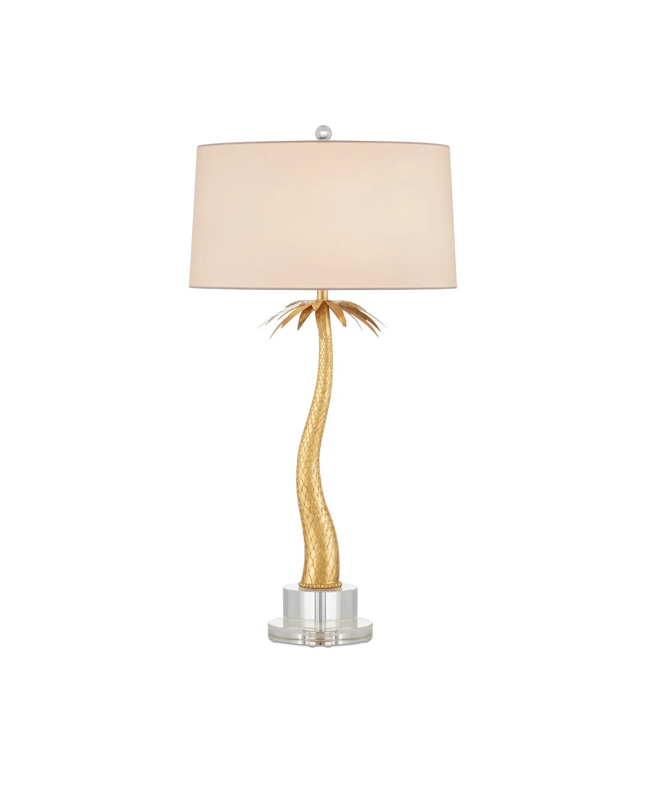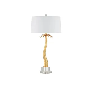 The Mazari Table Lamp features a bright gold stylized palm-tree profile. The swaying body is made of composite in a contemporary gold leaf finish, the slim form rising from an optic crystal base. Though this nature-inspired design brings a hint of the elemental indoors, it has a glamorous feel that will also add some bling to its spot in a room.