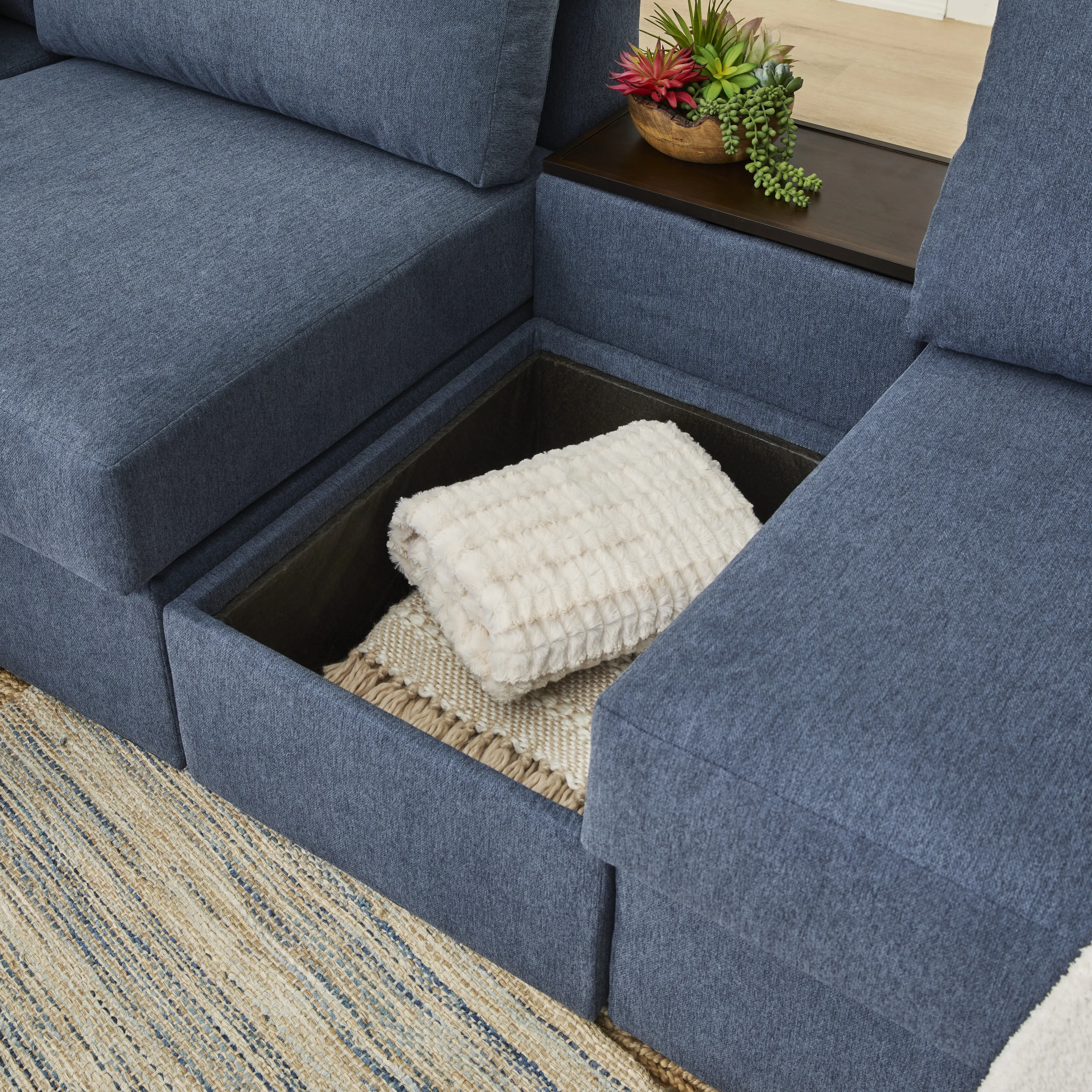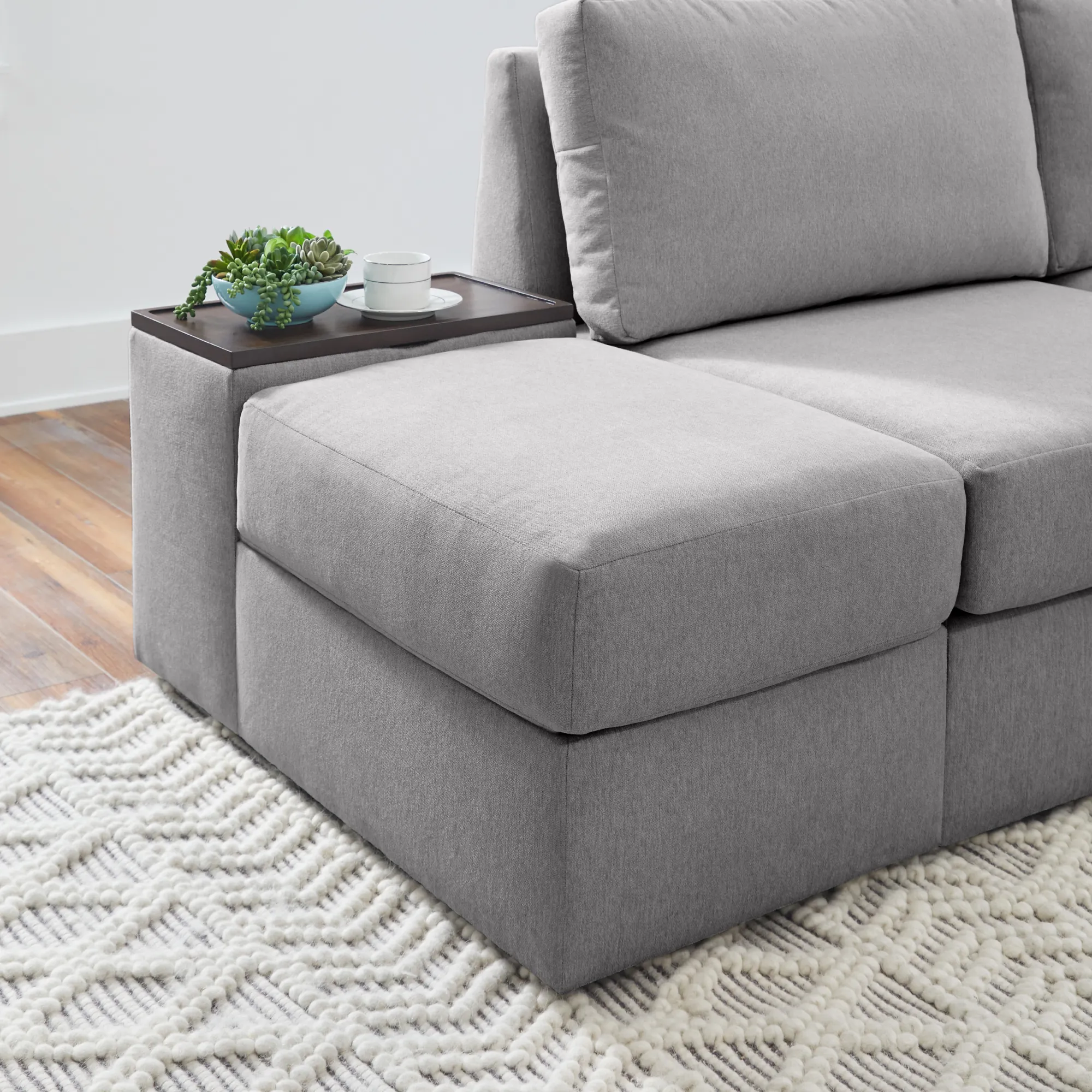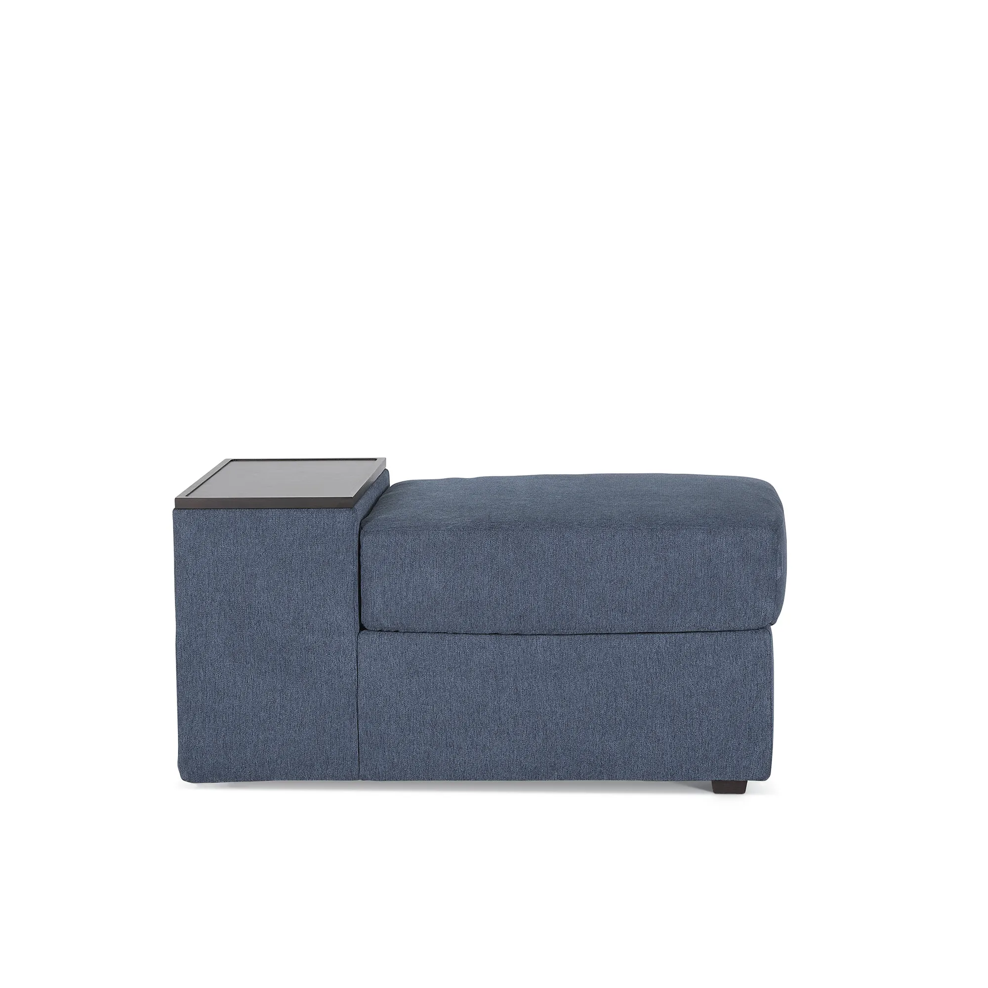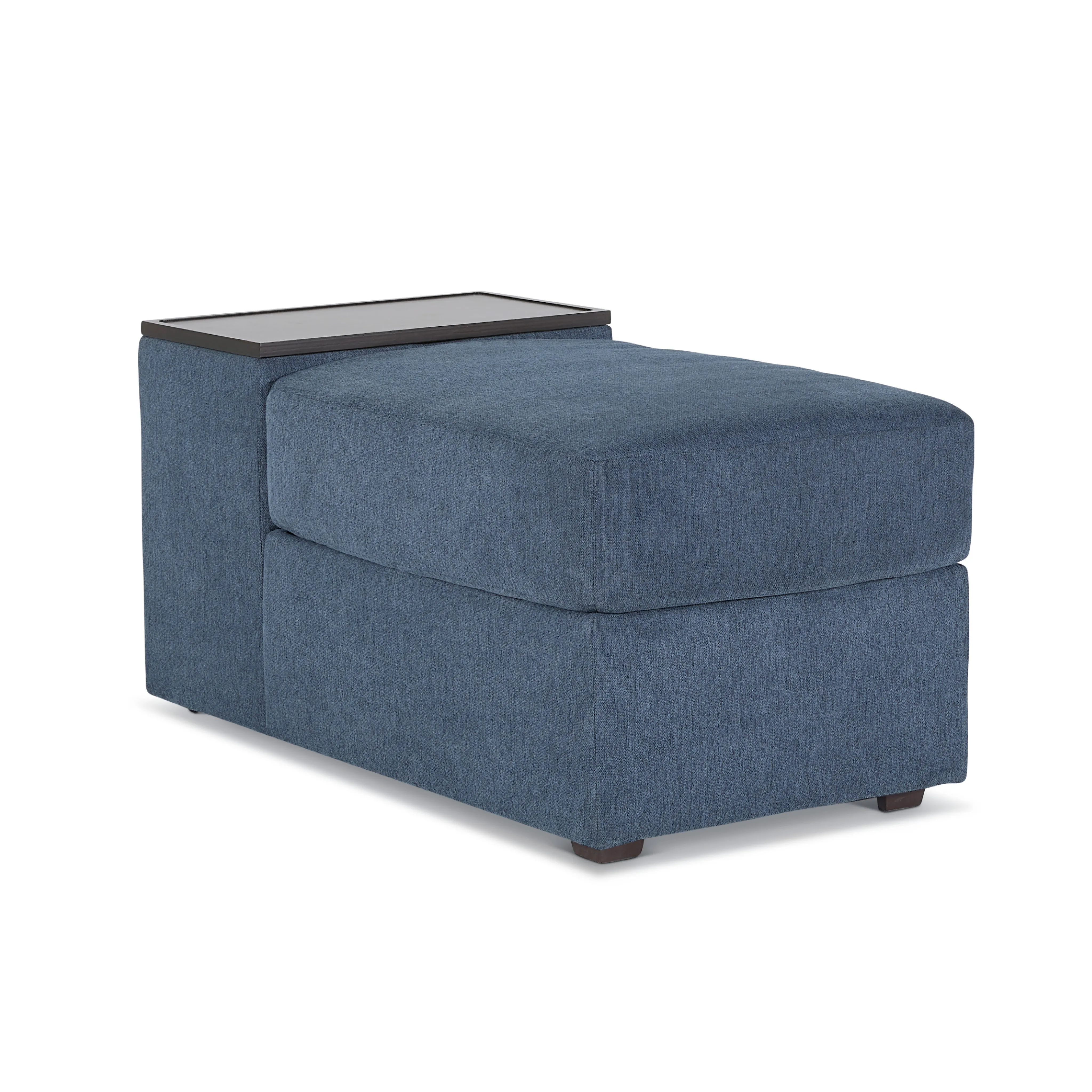 Evolve your Flex modular seating system with the Flex storage hub. Designed to offer additional seating to an existing sofa or sectional, this hub provides all of the storage a family needs. Two main compartments fit remotes, tablets, pillows, blankets and more under the removable wood tray and seat cushion. Upholstered in sustainable, stain-resistant performance fabric that is easy to clean. Attaches to any Flex seat in seconds with a C-Clip.