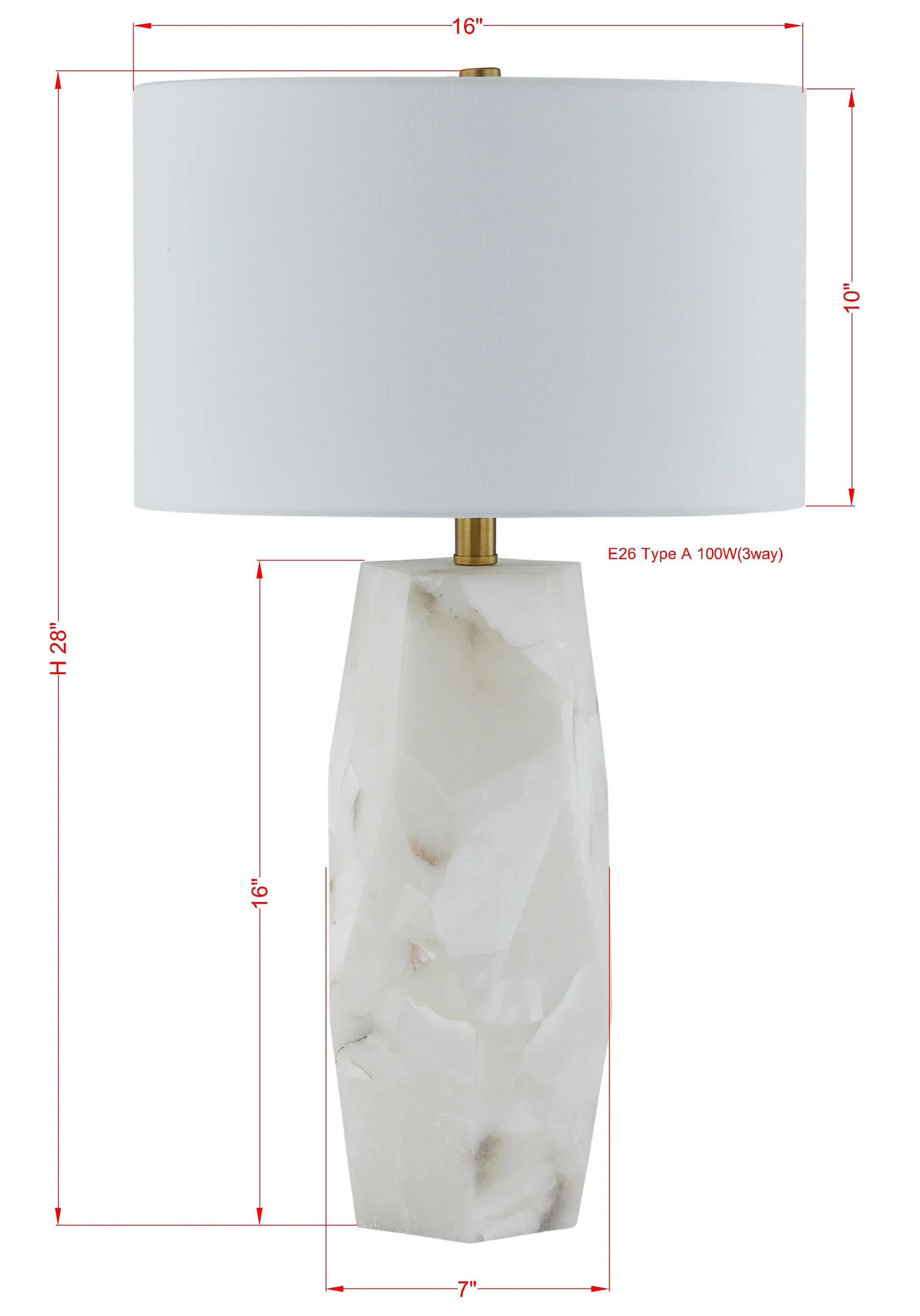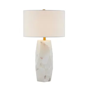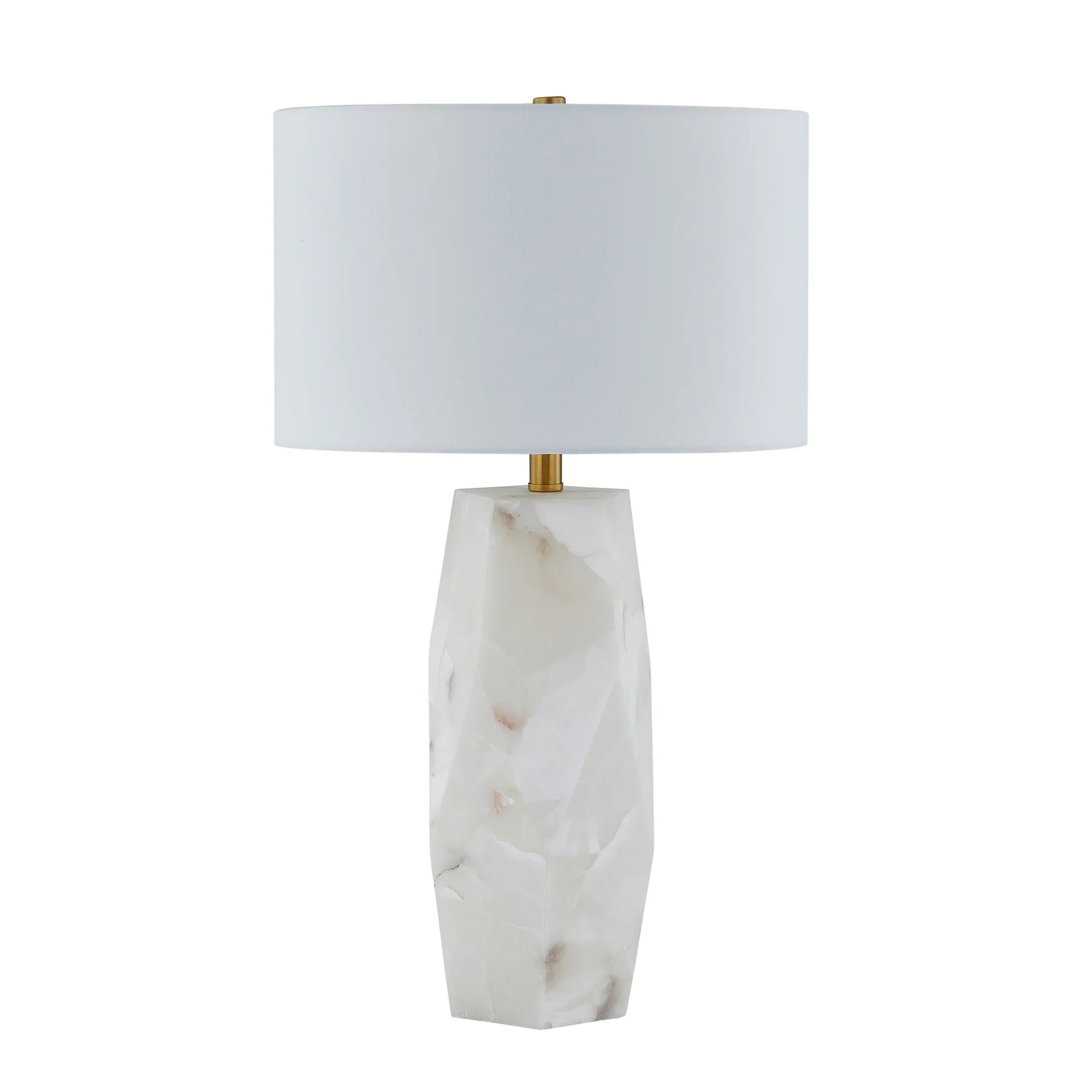 Audrey Table Lamp -This lamp is a timeless piece with an abundance of elegance, seamlessly blending luxurious materials with a sculptural silhouette. Crafted from alabaster, its geometric form showcases the stone’s natural variations, adding depth and sophistication. Gold hardware complements the design with a warm, polished accent, while a crisp white drum shade provides a soft, balanced glow.