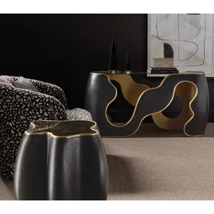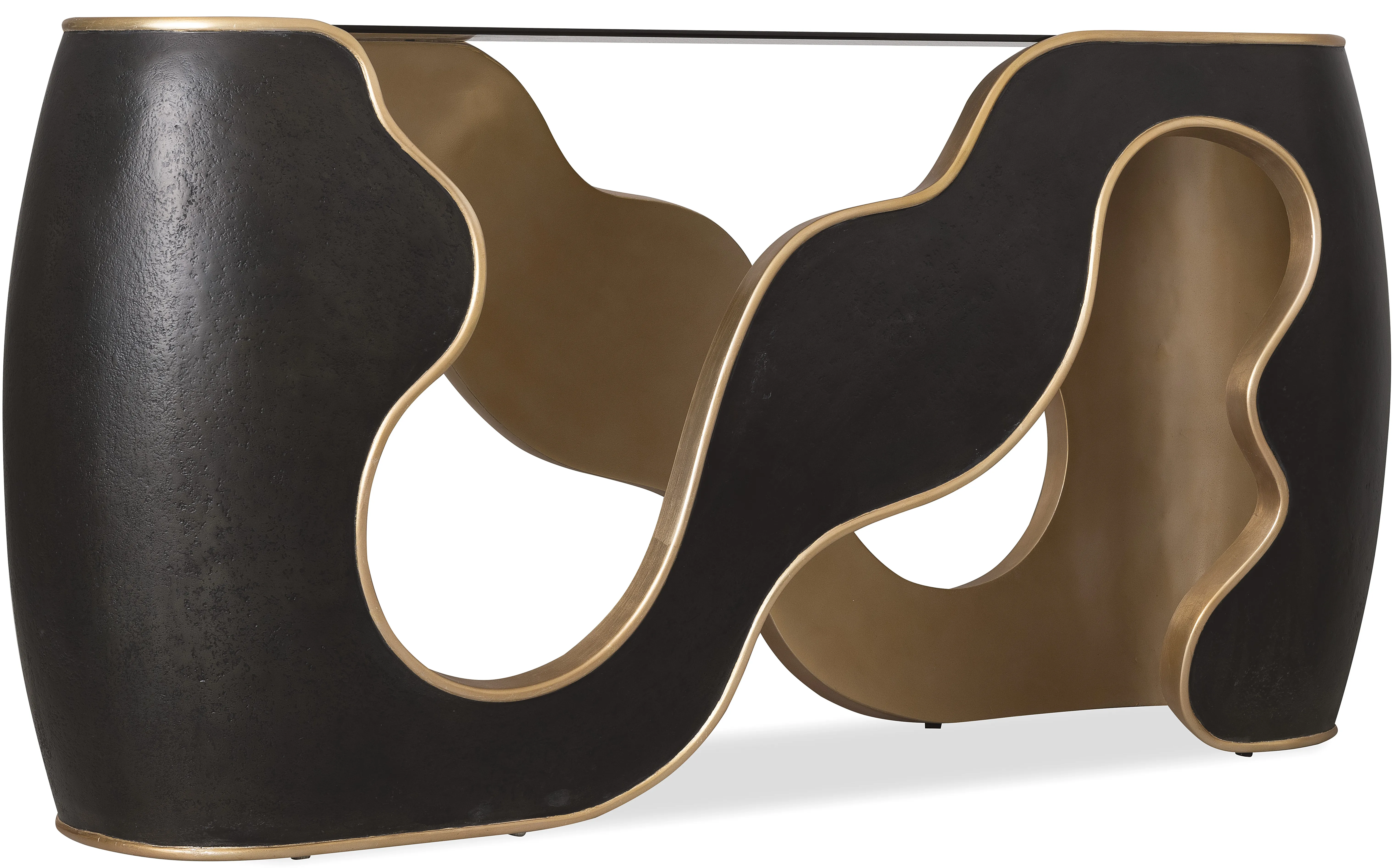 Elegant in contrast, the Even and Flow Console Table features a black exterior, gold interior accents, and a smoked glass top. Its minimalist lines and luxe finish create a sophisticated moment in entryways or living spaces.