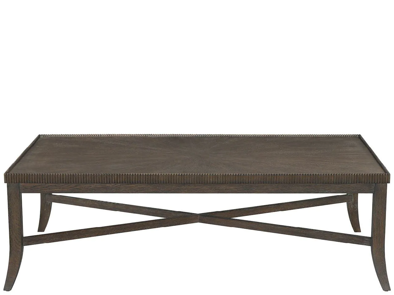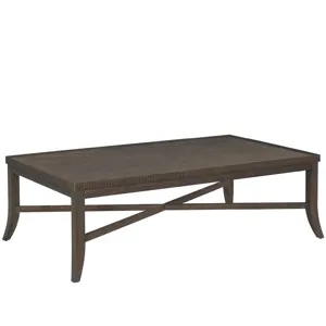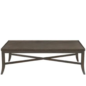 The Cocoa Cocktail Table features elegant beaded edge detailing and a distinctive curved leg design that adds graceful movement to a substantial rectangular form. Finished in signature Cocoa oak, this piece provides generous surface space while maintaining refined neoclassical proportions.