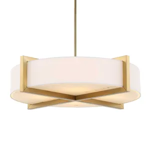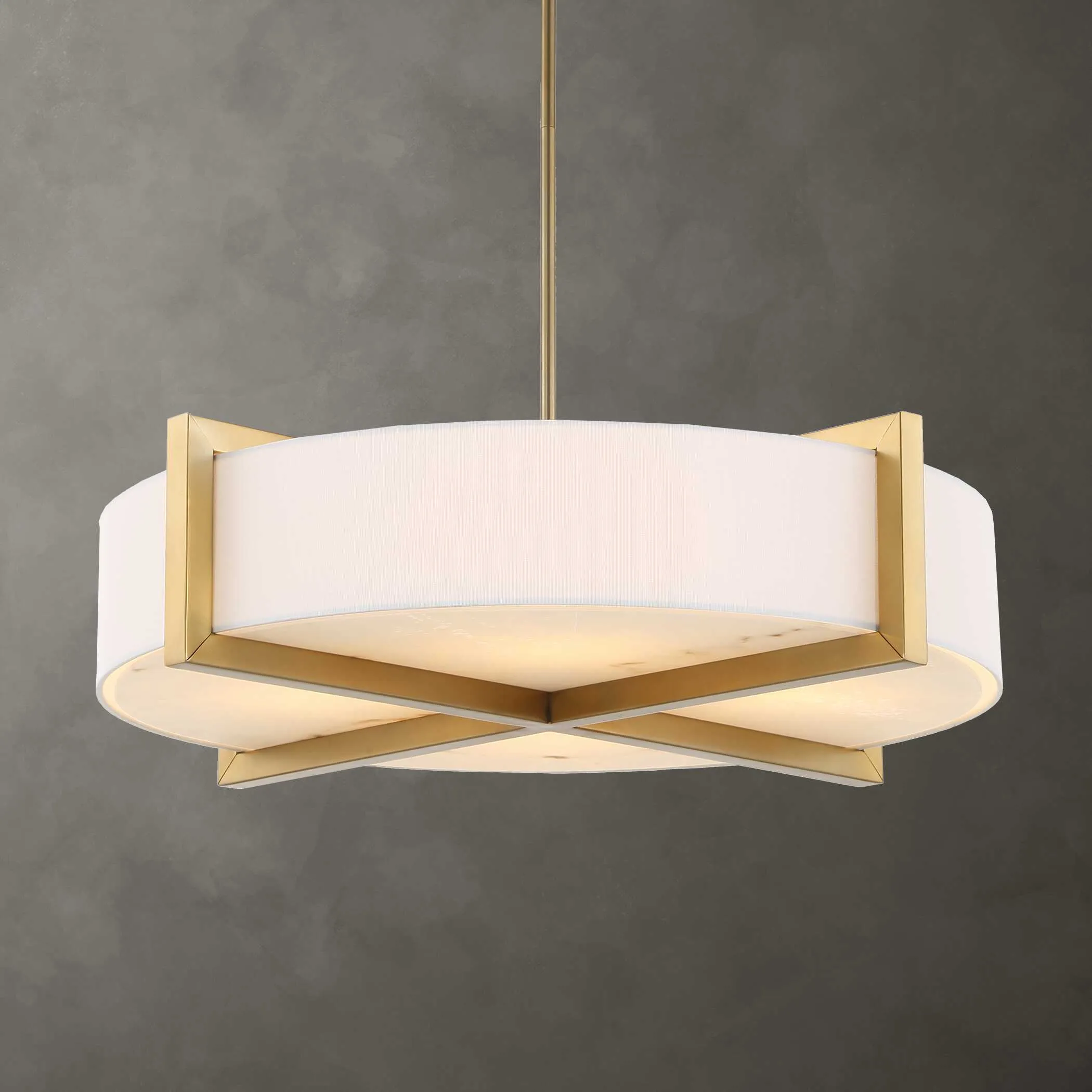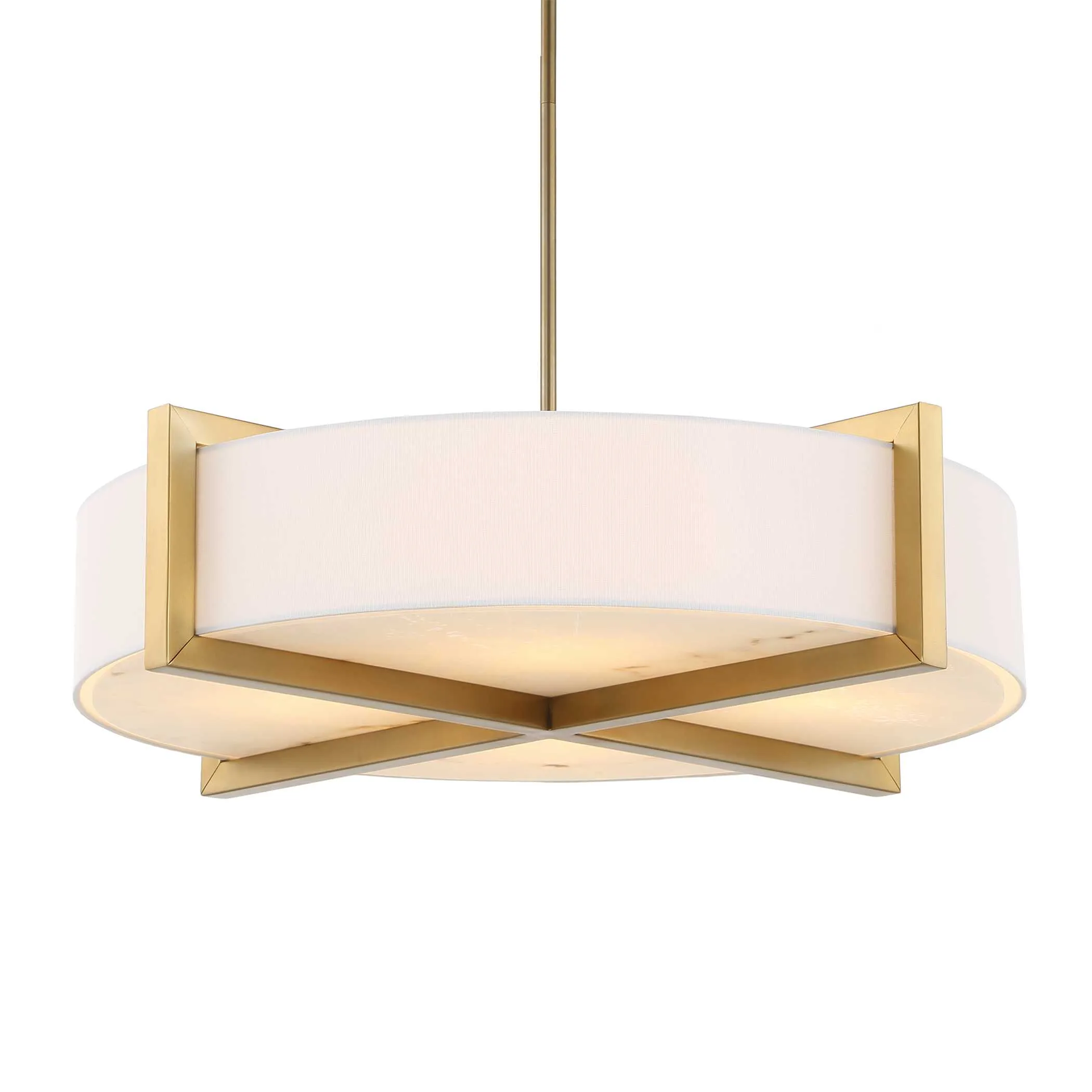 Hardback White Linen Hanging Shade With Architectural Beam Detail Enhanced In A Matte Brushed Brass Finish With A Lower Faux Alabaster Diffuser. 4-60 Watt Max, Edison Sockets. Bulbs Not Included. Supplied With 15′ Wire, 3-12″ Stems,and 1-6″ Stem For Adjustable Installation Also Includes 1-3″ Rod For Semi-flush Mounting Option.