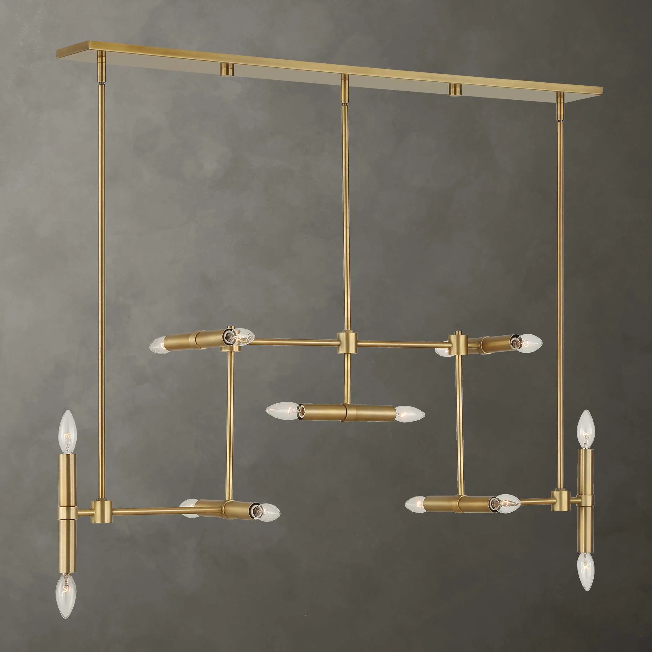 An Over-sized Framework Structure In A Clean Linear Pattern Gives Us This Unique Pendant In An Antique Brass Finish. 14-25 Watt Max Candelabra Sockets. Bulbs Not Included. Supplied With 15′ Wire, 9-12″ Stems And 3-6″ Stem For Adjustable Installation.