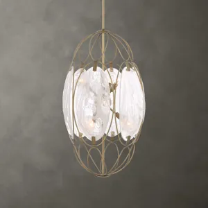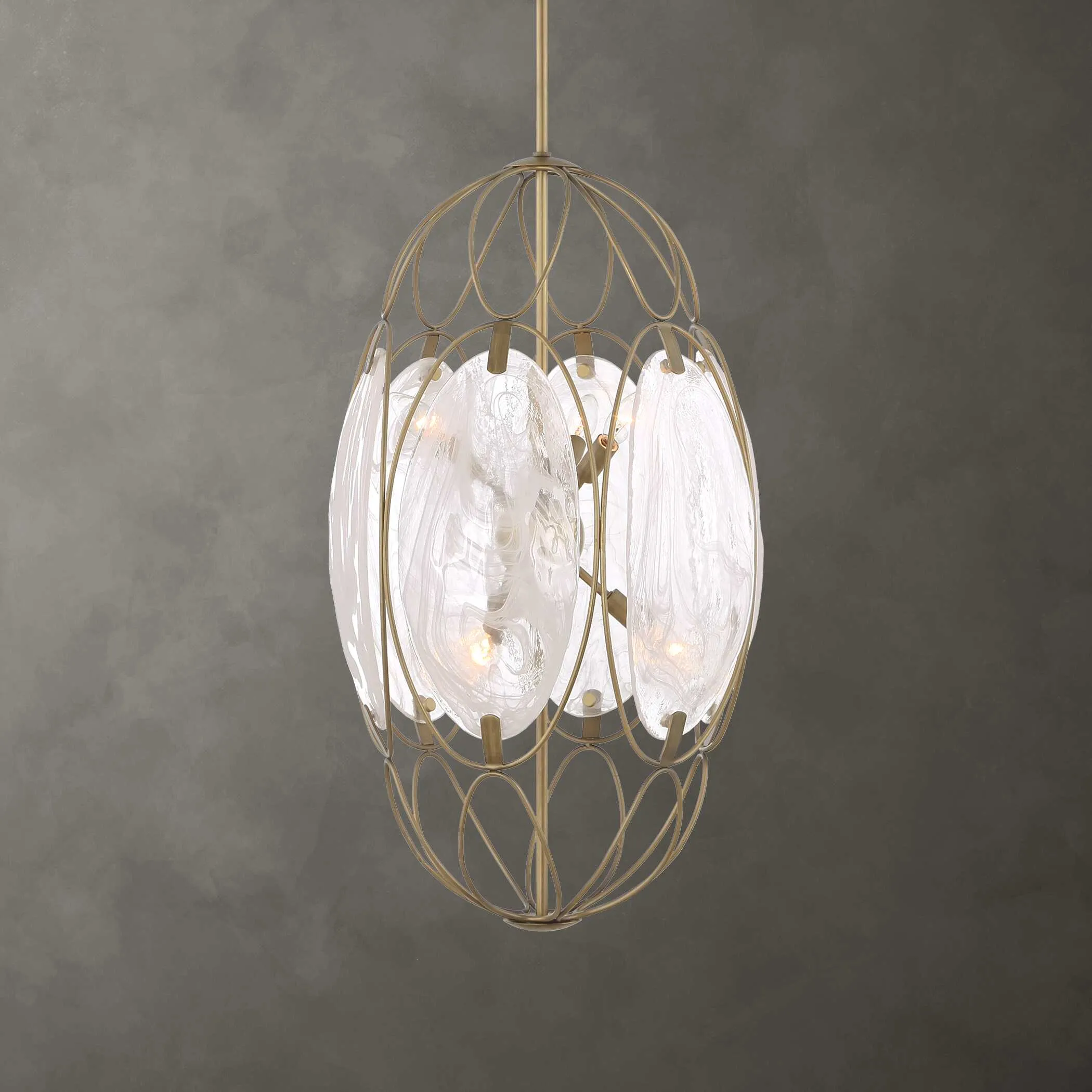 Interconnected Oval Shapes Make Up This Elongated Pendant. The Center Ovals Have Handmade Inset Swirled White Glass Panels. A Soft Gold Finish Refines This Rich Look. 6-40 Watt Max Candelabra Sockets. Designer Suggest G16.5 Bulbs. Bulbs Not Included. Supplied With 15′ Wire, 3-12″ Stems And 1-6″ Stem For Adjustable Installation.